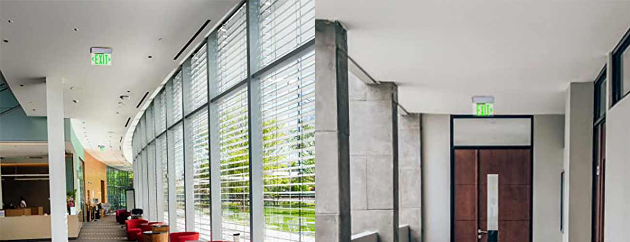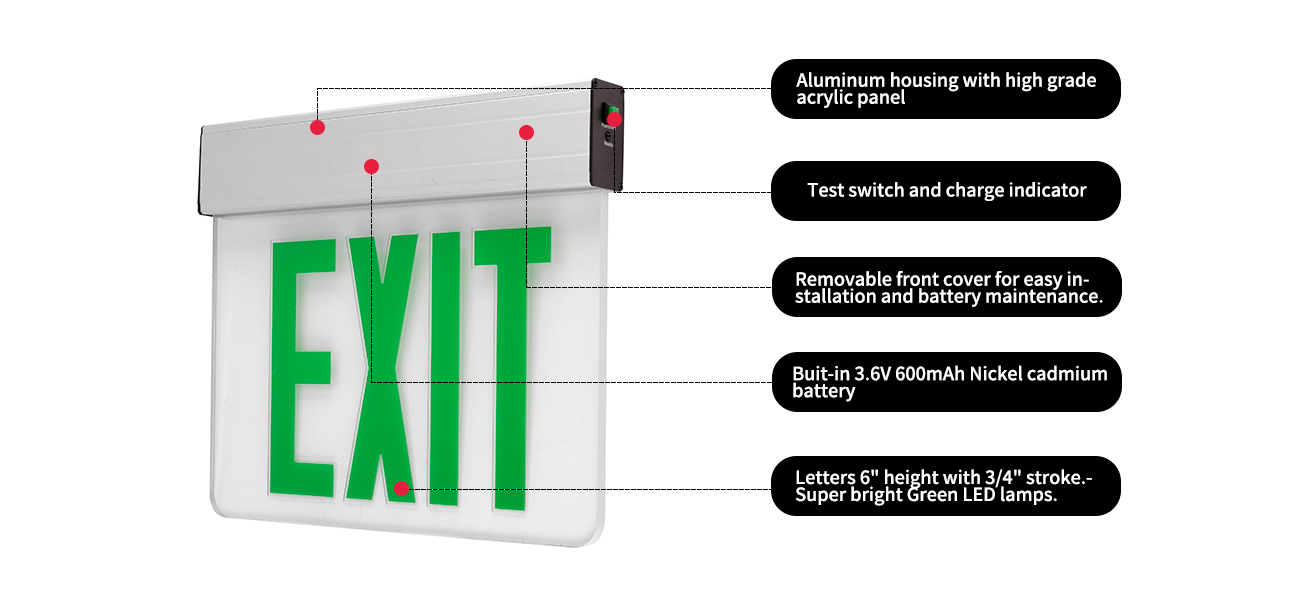 *Illumination - Diese Edge -Lit -Ausstiegsschilderreihe bietet eine LED -LED -Beleuchtung. Das Gerät ist mit einer grünen Hochleistungsplatine gebaut.  Der Energieverbrauch beträgt weniger als 3,5 Watt für die MC -Modelleinheiten. Der Energieverbrauch der Batterie -Sicherungseinheiten beträgt weniger als 1 Watt.