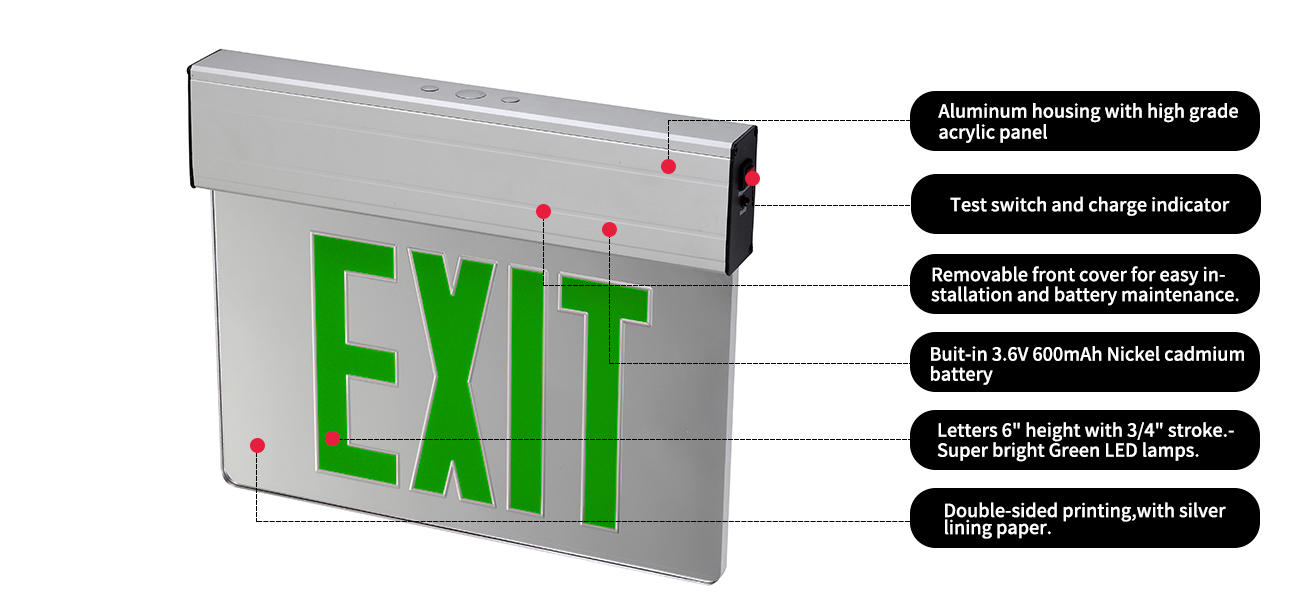 *Illumination - Diese Edge -Lit -Ausstiegsschilderreihe bietet eine LED -LED -Beleuchtung. Das Gerät ist mit einer grünen Hochleistungsplatine gebaut.  Der Energieverbrauch wird bei weniger als 3 Watt für die nur Modelleinheiten der Wechselstromeinheiten bewertet. Der Energieverbrauch der Batterie -Sicherungseinheiten beträgt weniger als 1 Watt.