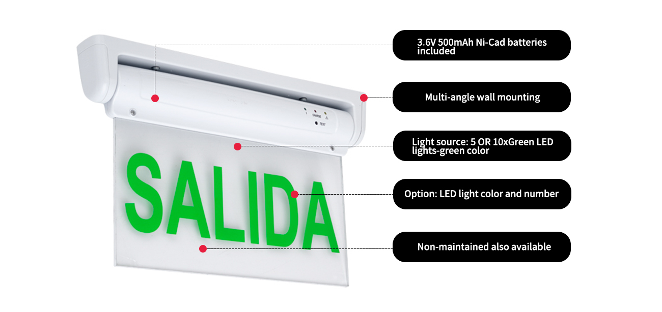 *Notstrombatterie-Sicherung-Das LED-Ausgangsschild wurde mit einer wartungsfreien 3,6-m-Ni-CAD-Batterie mit 3,6 V. 500 mAH ausgelegt, die eine minimale Notdauer von 6 Stunden bietet. Die Aufladungszeit des Akkus beträgt 24 Stunden.